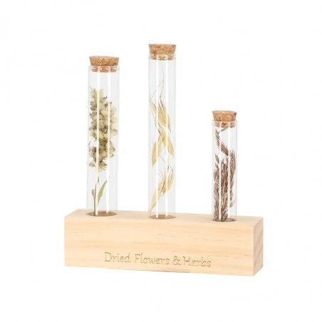Magnifique set de trois tubes à essai sur son socle en bois de pin. De dimensions différentes, ces trois tubes peuvent accueillir trois sortes de fleurs séchées. Elles seront protégées de la poussière grâce au verre.
