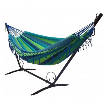 Hamac à franges, rayé et vert et bleu, pour 1 personne. Son rapport qualité-prix vous étonneront, et vous profiterez de moments de détentes inédits !