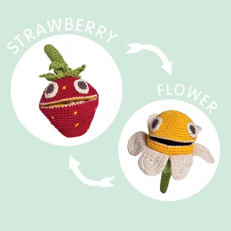 Peluche en forme de Fraise réversible qui convient aux bébés dès la naissance. En forme de fleur qui se transforme en fraise. Cela permet aussi de sensibiliser les enfants à la nature et à l’alimentation dès le plus jeune âge.