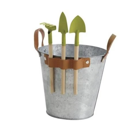 Kit enfant complet ! Pour offrir aux enfants, cadeau idéal pour transmettre les valeurs simples du jardinage. Seau en zinc équipé de 3 outils pour enfants : un mini rateau, une mini pelle et un mini plantoir. A partir de 3 ans. Matières du seau : zinc, anses en cuir. Outils : bois et métal. Dimensions du seau : diamètre 18 cm, Hauteur 17,5 cm. Poids 0,33 kg.
