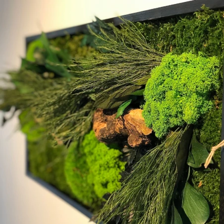 La couleur noire du cadre ou du fond du tableau végétal lui confère une apparence élégante et moderne, ce qui en fait un choix polyvalent pour différents styles de décoration d’intérieur. Les végétaux stabilisés utilisés peuvent varier, mais généralement, on retrouve des mousses, des fougères et d’autres plantes à feuillage dense qui donnent une impression de verdure luxuriante.