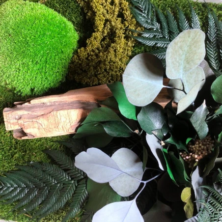 Les plantes stabilisées utilisées dans ce tableau sont traitées avec des produits naturels et écologiques qui préservent leur aspect naturel et leur fraîcheur pendant une longue période. Les nombreuses plantes intégrées dans le tableau offrent une diversité de couleurs, de textures et de formes, créant ainsi un tableau vivant et dynamique.